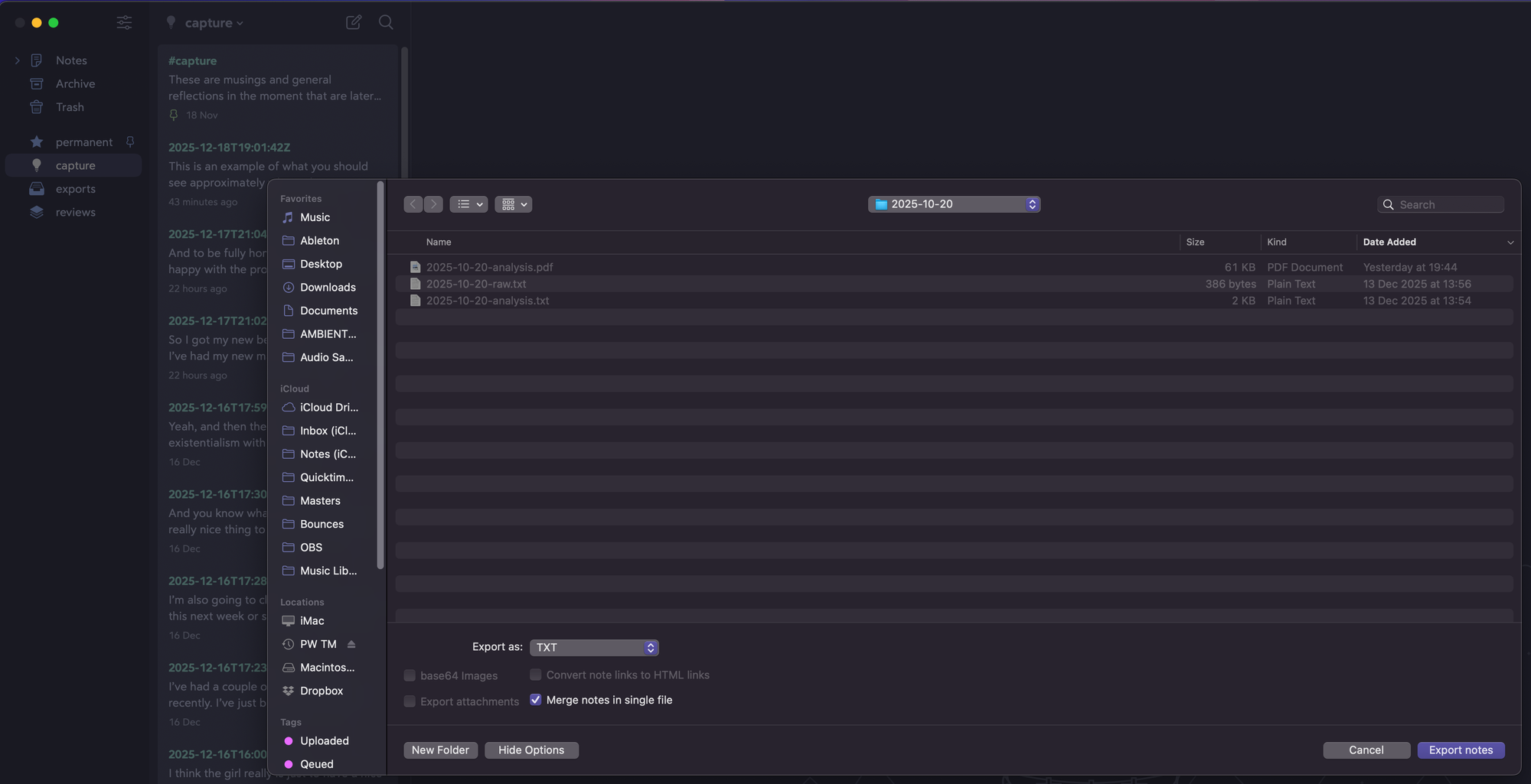 Go to your #capture tag and select all notes. Export all your Bear notes from the week and merge them into a single .txt file using the checkbox. This consolidates the week's material and prepares it for review.